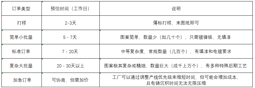 2. 訂單數(shù)量:批量越大,電鑄沉積的時(shí)間越長,后期加工(如切割、填漆)的時(shí)間也相應(yīng)增加。